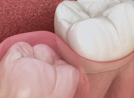 Восьмёрка упирается в соседний зуб, не может нормально прорезаться, вызывая давление, боль и иногда смещение прикуса.